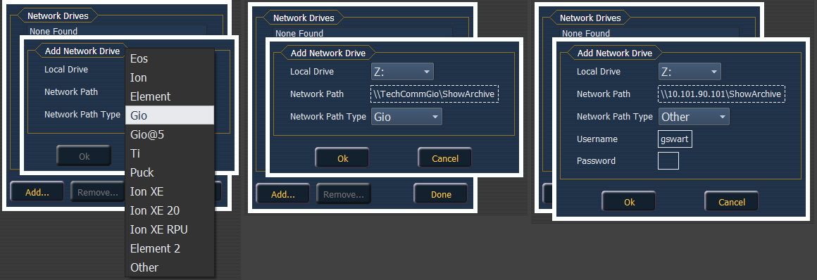 Das Dialogfenster {Netzwerklaufwerke ...} enthält eine Taste {Hinzufügen}, um ein Netzwerklaufwerk zuzuordnen. Im Dialogfenster „Netzwerklaufwerk hinzufügen“ wählen Sie den gewünschten Laufwerksbuchstaben, den Netzwerkpfad und den Pfadtyp aus. Als Netzwerkpfad kann entweder die IP-Adresse oder der Gerätename verwendet werden. (Beispiel: \\10.101.90.101\ShowArchive oder \\IhrGerätename\ShowArchive). Der Typ des Netzwerkpfads muss mit dem des Gerätes übereinstimmen. Wenn „Andere“ gewählt wird, müssen Sie zusätzliche Felder für Benutzernamen und Passwort ausfüllen.