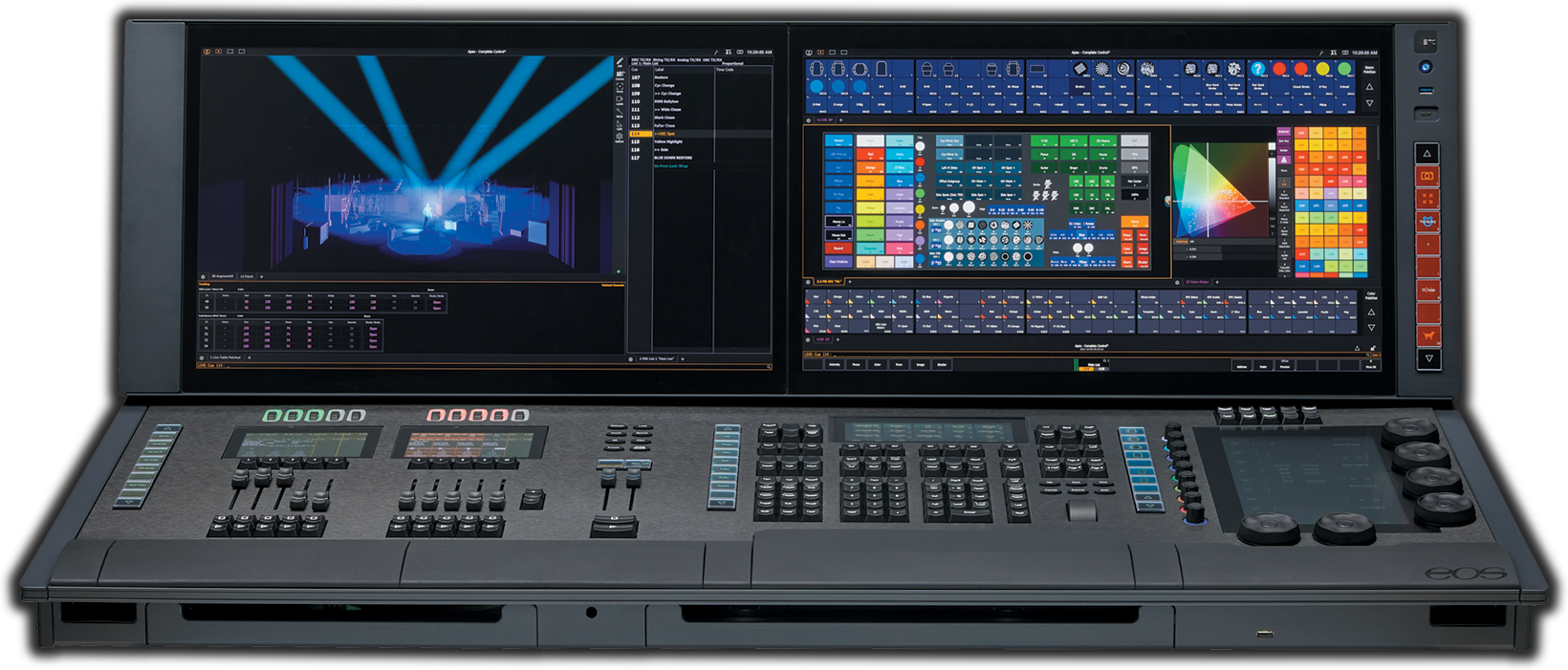 The Eos Apex 10 console is engineered for comfort and customization, with generous programming surfaces and the power to run complex lighting and media rigs. As the mid-sized console in the Apex class of lighting controllers, the Eos Apex 10 offers a hands-on, professional workspace.