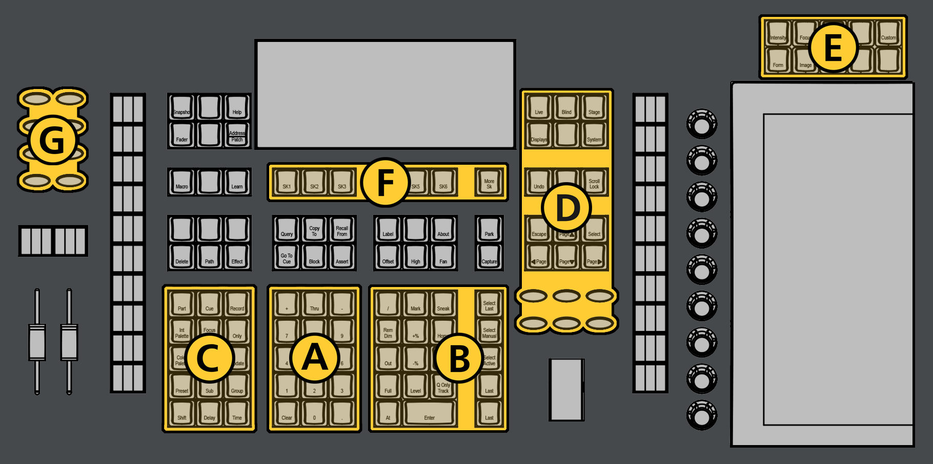 A Keypad The numeric keypad allows you to type numbers for channel or target selection via the command line, along with modifier keys to alter your selection.