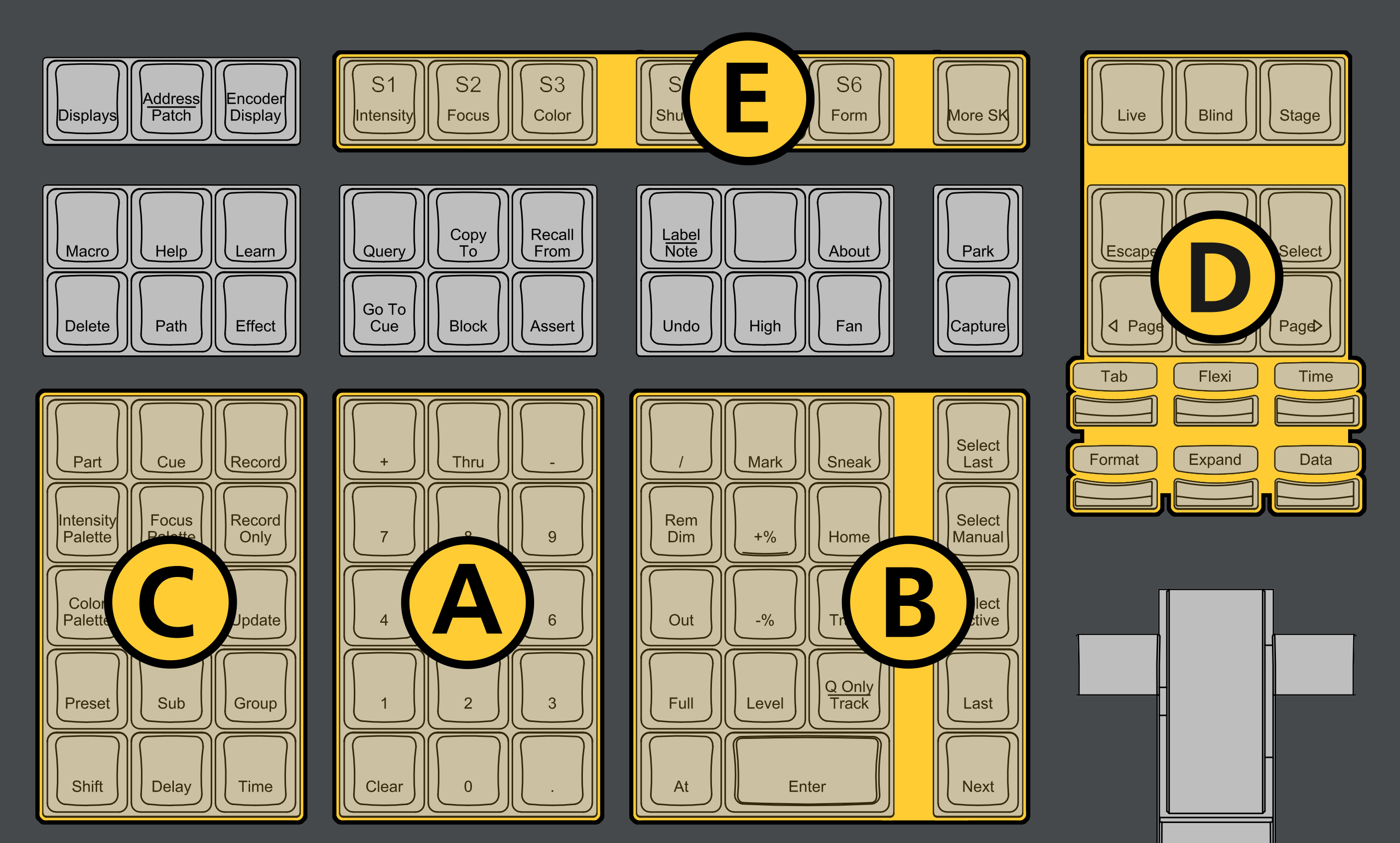 | A | Keypad | The numeric keypad allows you to type numbers for channel or target selection via the command line, along with modifier keys to alter your selection. |