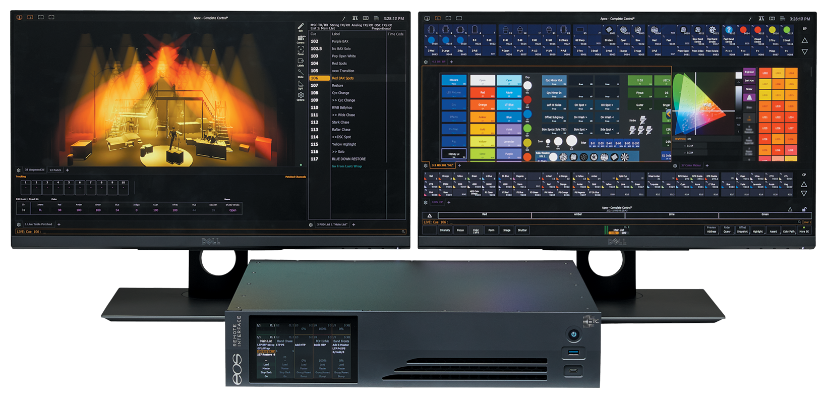 The Eos Remote Interface provides the same access to your system as a console - without the added cost of output control. Perfectly at home on a tech table or in an equipment rack, the Remote Interface supports up to three 4K multi-touch monitors and connects to your Eos Family lighting controller through Ethernet.