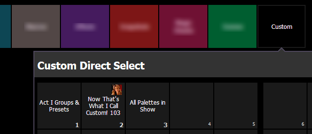 Custom Direct Selects [Tab 39] allow you to assign multiple target types to the same grid layout. If {Custom} is selected on the direct selects tab, a popup will appear showing all available custom direct select lists in your show file.