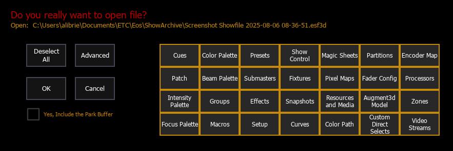 To load a show file with the parked elements from the buffer included, select the box labeled Yes, Include the Park Buffer.