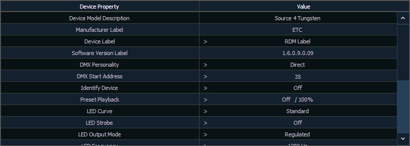- {Device Properties} - opens the properties list for the selected RDM device.