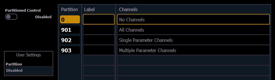 - Partition 0 - no channels and no fader control. This is the default for all users when partitioned control is enabled for the first time on a show. To gain control, you must select a different partition.