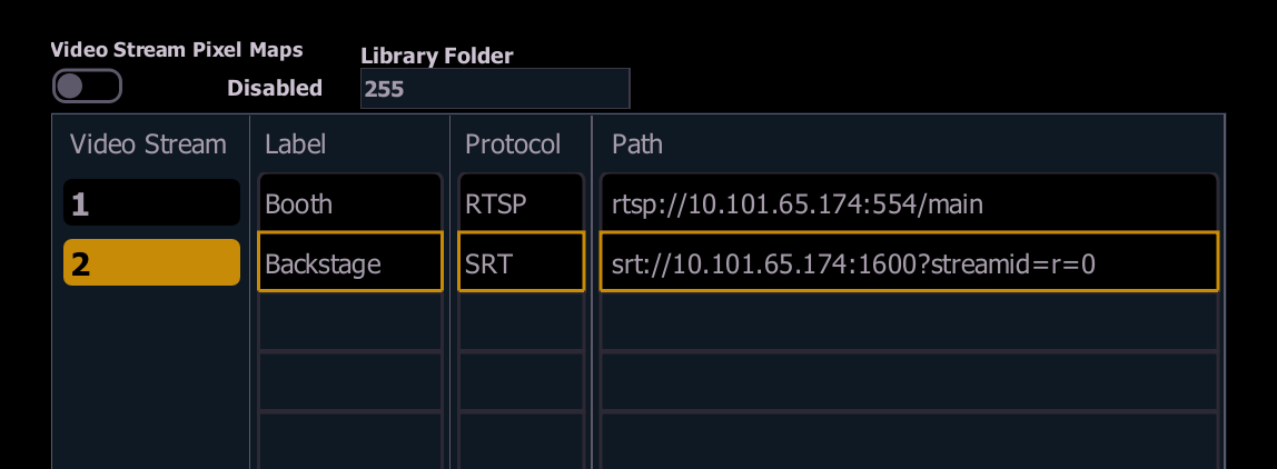 For example, a camera with an IP of 10.101.65.174 would use srt://10.101.65.174:1600?streamid=r=0 as the address.