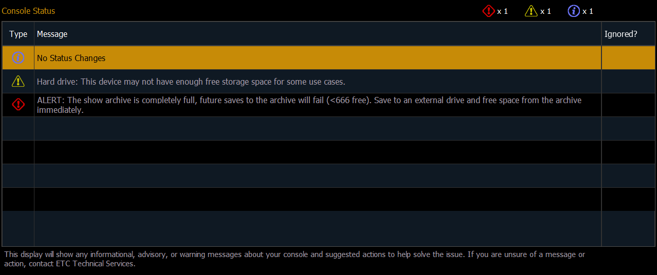 This display shows informational, advisory, or warning messages about your device. Console Status can be opened via Browser > Setup, or through About > Console Status.