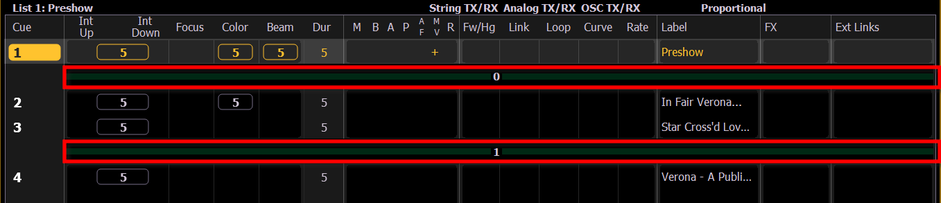 Scenes display in the cue list index and the playback status display as a green bar above the cue they are associated with in the list. An end of scene can also be created, and those display as a green bar under their associated cue.