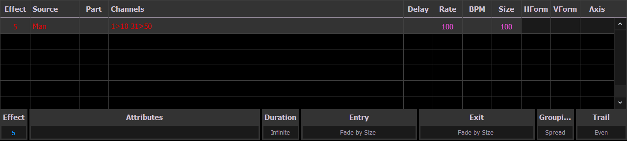 Selecting the Attributes column will open the effect attribute override display. From that display, you can access most of the same properties as those found in the effects editor. This display allows you to make modifications to properties, and store those modifications in a cue or submaster.