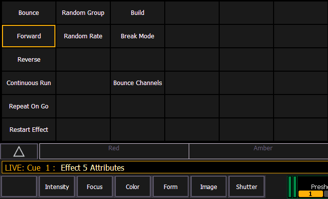 {Restart Effect} is an atrribute that can only be accessed from this display. When enabled, {Restart Effect} will cause an effect to restart whenever the cue is fired. This attribute is applied to the cue that the effect is stored in and not in the effect itself.