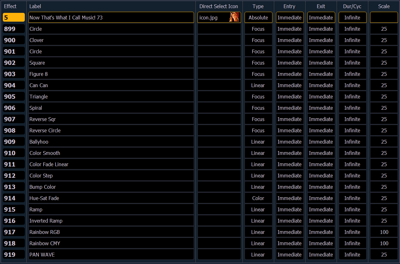 Notice that there are effects existing in this list prior to any being recorded. Effects 901-918 are pre-programmed Relative Effects that are automatically available.