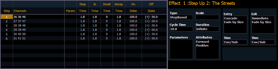 In step effects, each step contains an on-state and an off-state. The on-state is the action the channels in the step should take when the step is active. The off -state is the action the channels in the step should take when the step is not active. Step effects are a quick and easy way to build simple chases.