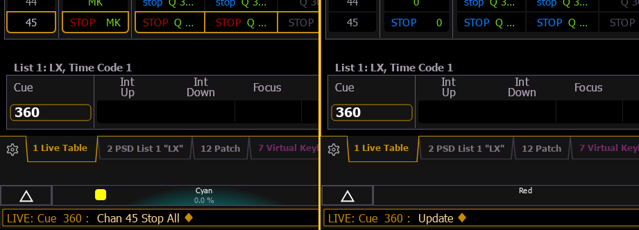- <Chan> [1] [Stop Effect] [Enter] - creates a stop effect instruction for all selected parameters, if there isn't an effect running on any of the parameters.