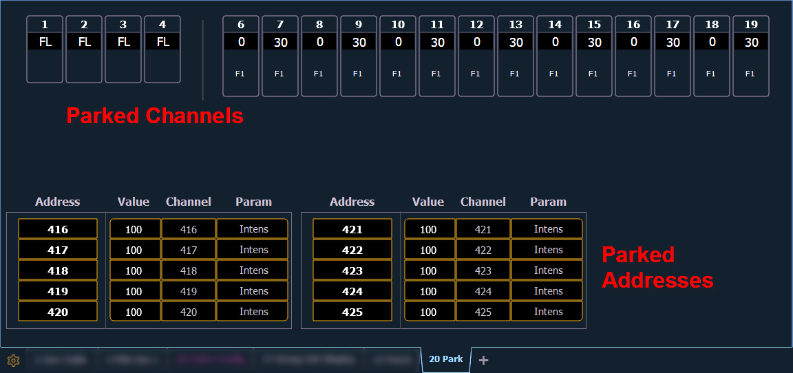 You can park and unpark channel parameters or addresses from the park display. Open the display by pressing [Park] [Park] or [Tab] [2] [0]. While in this display, it is assumed that you want to park channels or parameters, therefore the use of the [Park] key is not necessary when parking, but is used for unparking. You can also use [At] [Enter] to unpark.