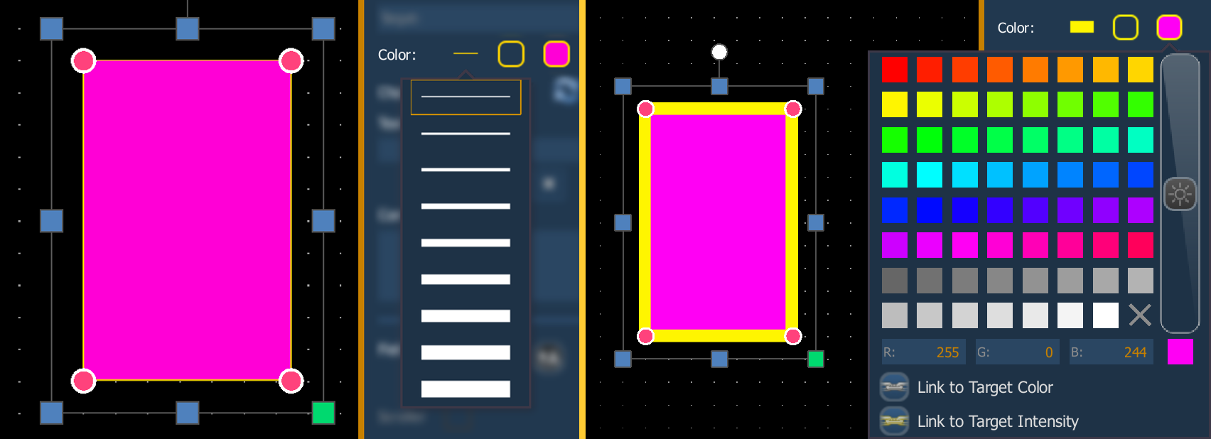 - {Link to Target Color} - if the target has associated color parameters (such as a channel controlling an LED fixture), this option associates the object's outline color or fill color with the live color of the target. If the target has no color parameters, the object color will appear as selected.
