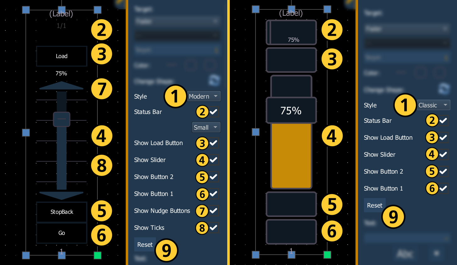 | 1 | {Style} | Toggles the visual style of the fader between Modern and Classic. Choose an option from the dropdown. |