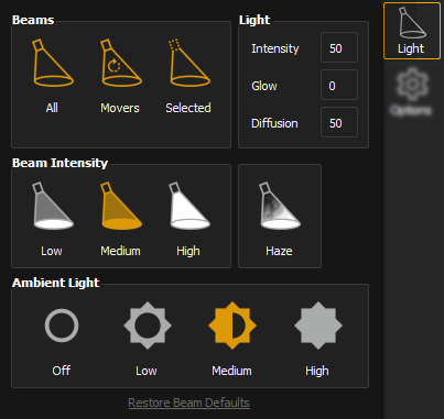 Toggles between low, medium, and high intensity simulated beams. Toggle Haze on to increase the realism of the beams.