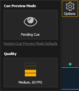 Reset Cue Preview by clicking Cue Preview Mode Defaults. An eye will appear on the Options icon when in Cue Preview mode. Also available in Preferences.