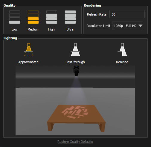 Allows you to adjust the quality of the Augment3d render, the Refresh Rate, and the Lighting mode. Eos Apex consoles and ETCnomad on Windows and macOS allow you to set a resolution limit to improve performance. Also available in Preferences. See Graphics.