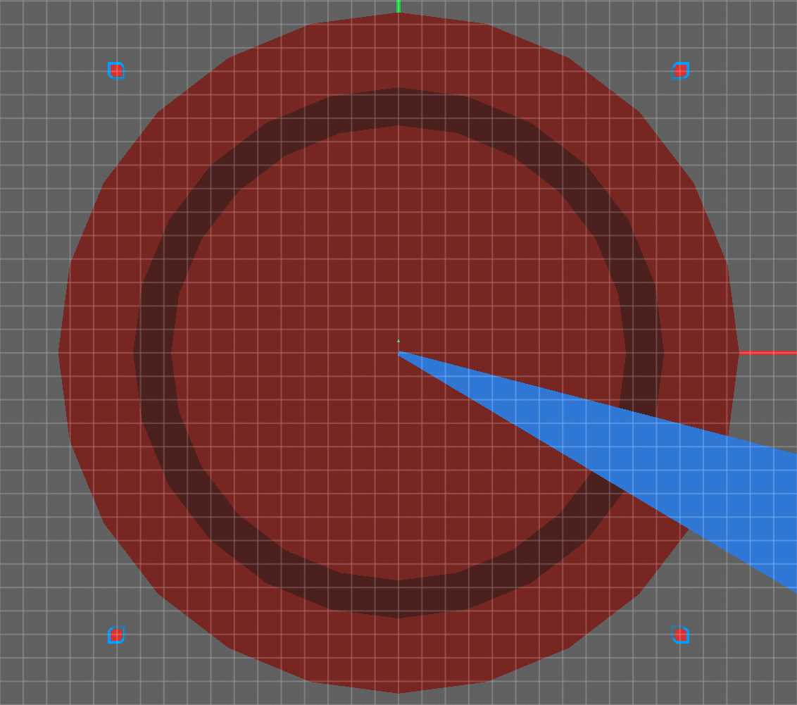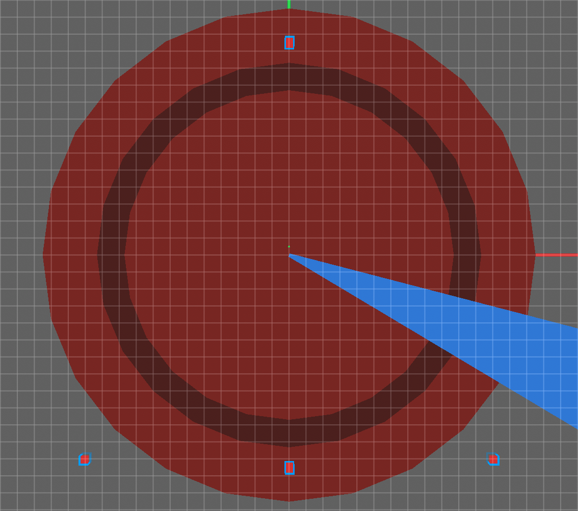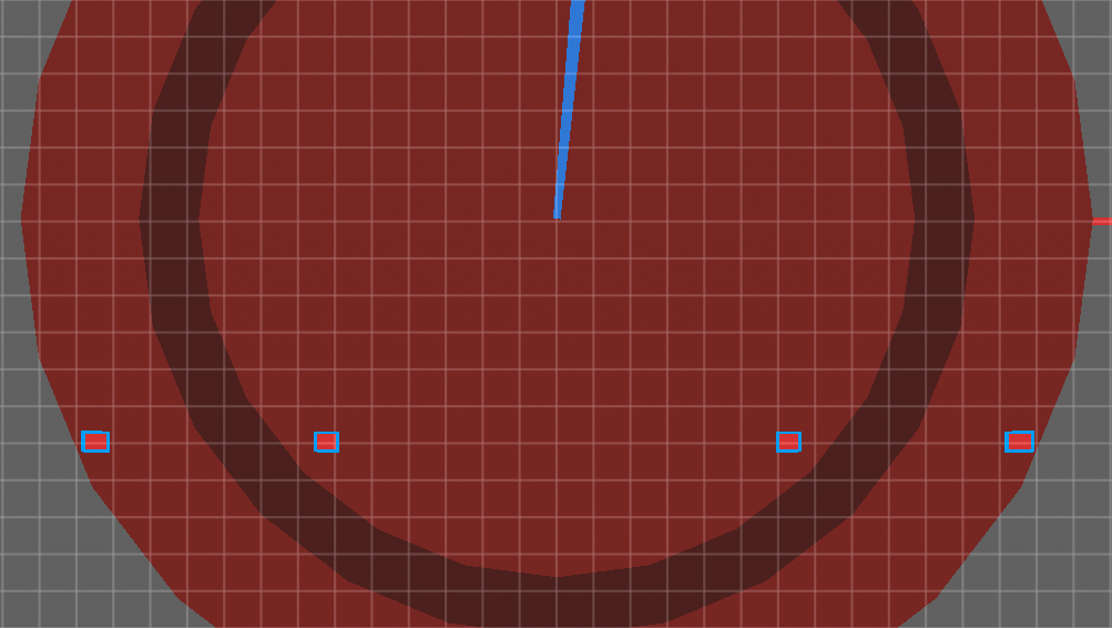 A better (but still problematic) configuration is pictured above. Since one of the points is in a line between two others, the data from that point is redundant and cannot be used to calculate the fixtures' positions.