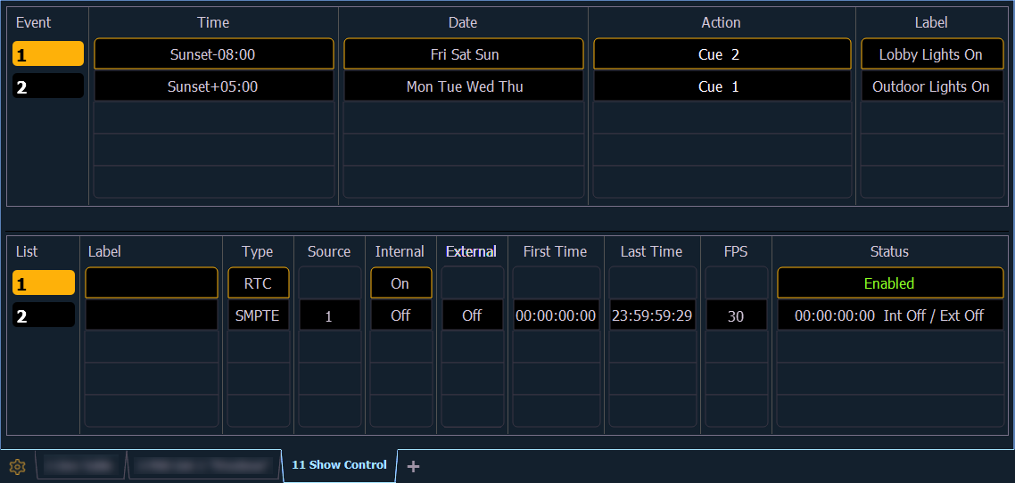 The Show Control display allows for the creation of show control events, organized into event lists. An event list defines how incoming show control events are processed by the console – any protocol that can be received by the console is handled here. Each event list is assigned a type of show control (timecode, analog inputs, RTC, or network). Specific information about setting up events for each show control type can be found later in this guide.