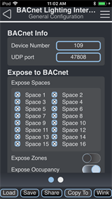 All 16 Echo Spaces can be controlled and monitored through BACnet client applications. Tap the box next to a space to expose it for BACnet control. A deselected space will not communicate any properties to BACnet.