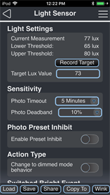 Note:  Changes made to the Light Sensor configuration settings using the EchoAccess Mobile App impact the behavior of the sensor when Custom Config mode has been enabled (set to On). The Custom Config mode DIP switch is located on the circuit board (rear side), of the sensor . A sensor placed in Basic Config mode (Custom Config DIP switch set to Off) is unaffected by EchoAccess Mobile App custom configuration settings.