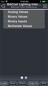 Note: The dots at the bottom of the screen indicate additional pages of configuration for the selected interface. Swipe left or right to access the BACnet Points page.