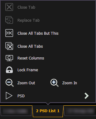 Every frame has a gear icon in the lower left corner of the frame at the start of the tab bar. Selecting this icon will open the tab tools menu, which provides options for opening and closing tabs in that frame. Tab tools can also be opened by double-selecting or context-selecting a tab in focus.