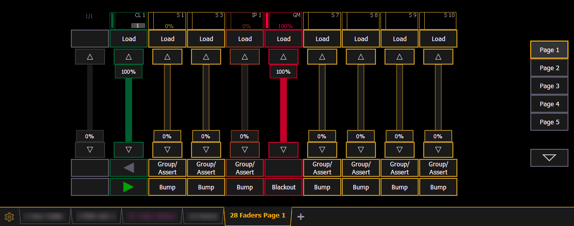 The Faders display ([Tab] [2][8]) provides pages of virtual fader modules.
