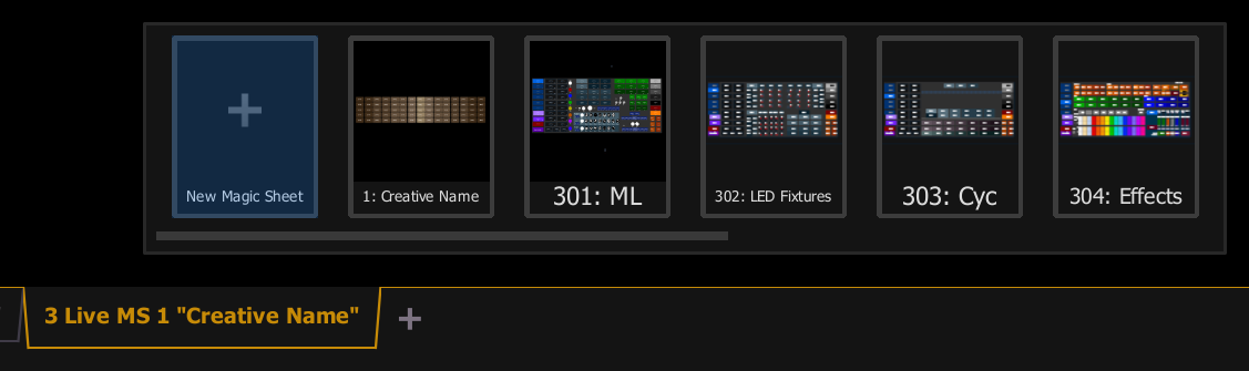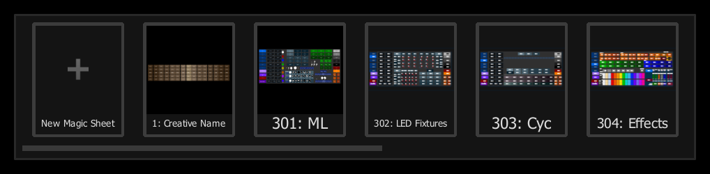 By default, the tab opens to the magic sheet browser. If no magic sheets exist in the show file, the browser will be empty. Use the {New Magic Sheet} option to create the lowest new magic sheet number available. Created magic sheets are available via the browser alongside all other magic sheets in the show file.