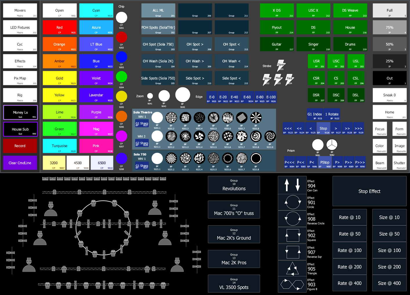 Magic sheets are user-created interactive displays that allow you to customize how you interact with and view your show data and lighting system. A variety of objects can be tied to show data, such as channels, palettes, and other record targets, and added to a custom layout with additional graphics and icons.
