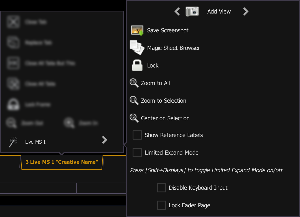 - Add View - different views of the same magic sheet can be saved and recalled. Zoom and pan the display to change the view, and then select {Add View} to save. To change views, use the arrows on either side, or Multi-Touch Gestures. You can also use {Magic Sheet} [Magic Sheet Number] [/] [View Number] [Enter] to open a specific view.