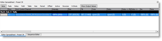 Use the Editor Spreadsheet to edit the stored values within presets, palettes and sequence steps. Buttons are provided at the top of the Editor Spreadsheet (Value, Fade, Delay, Path... etc.) when an object is in "Edit Mode" (reference Edit Preset, Edit Palette, Edit Sequence). Use these buttons to filter the spreadsheet data, for easy viewing and editing of the specific parameter values.