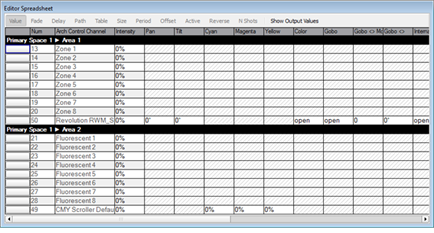 Use the Editor Spreadsheet to edit the stored values within Presets, Palettes and Sequence steps. Buttons are provided at the top of the Editor Spreadsheet (Value, Fade, Delay, Path... etc.) when an object is in Edit Mode (reference Edit Preset, Edit Palette, Edit Sequence). Use these buttons to filter the spreadsheet data, for easy viewing and editing of the specific parameter values.