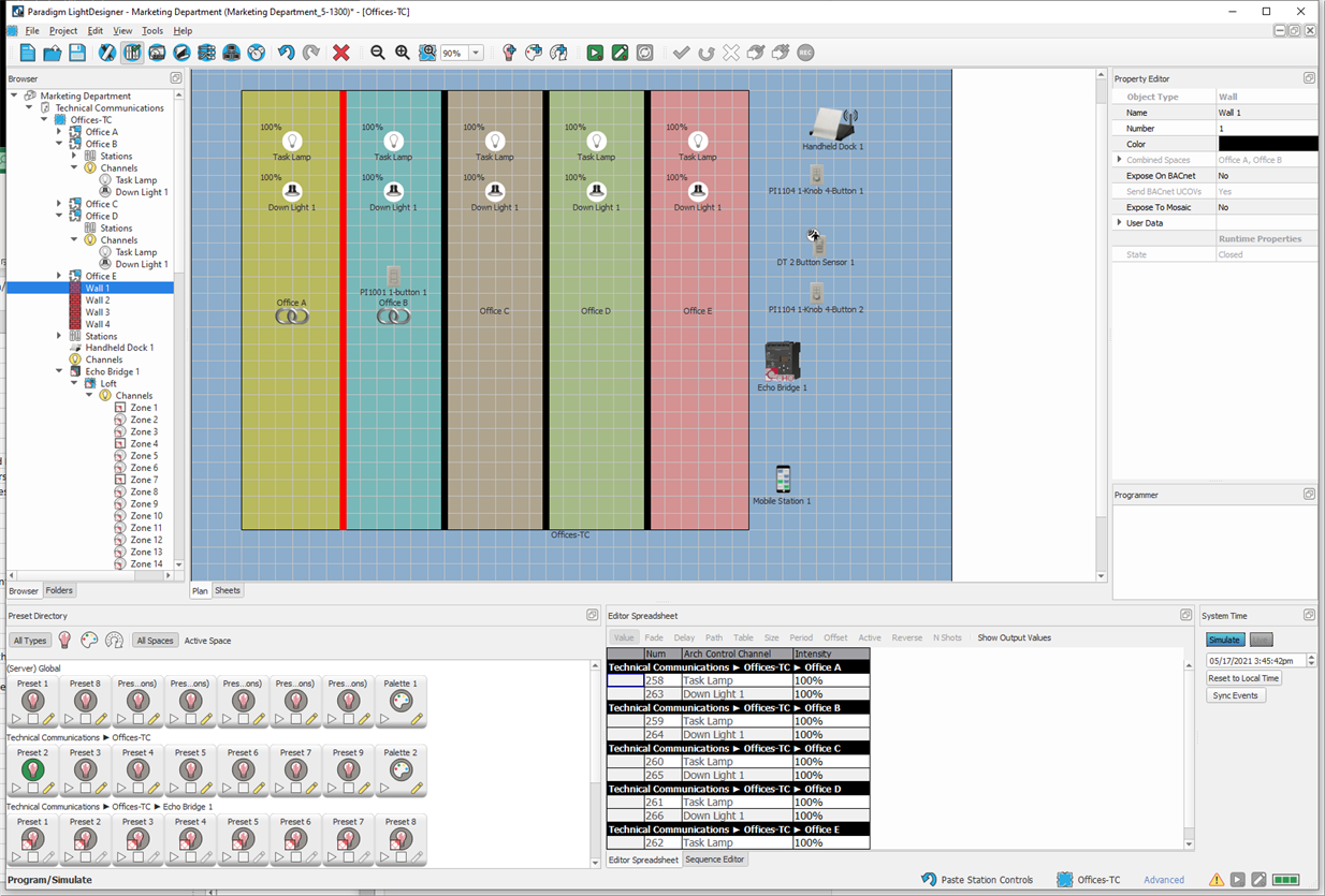 The Program/Simulate view is provided to program and simulate the functions of the system channels and controls created in the Design view. When you worked in the Design view, you developed the spaces, added channels, stations, Echo Expansion Bridges, and partitioned walls to project.