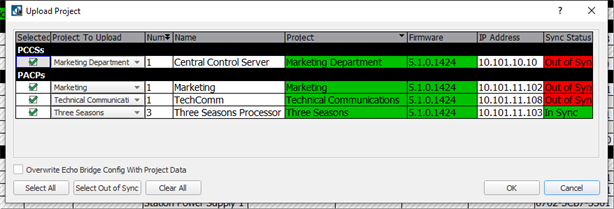 When the LightDesigner configuration file differs from the configuration on connected Paradigm processor(s) or Paradigm Central Control Server, the synchronization status will display as "Out of Sync" in the device list. Upload the current LightDesigner configuration to the connected Paradigm processor(s) using the [Upload Project] button in the Network view.