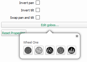 Fixtures with gobo wheels will display an Edit gobos... button within the Fixture Properties tab. Clicking it will show the current gobos set for the available wheels. Clicking any of the wheels will open the gobo image picker allowing you to choose the gobo image that matches gobo wheel that is or will be located in that fixture's gobo wheel.