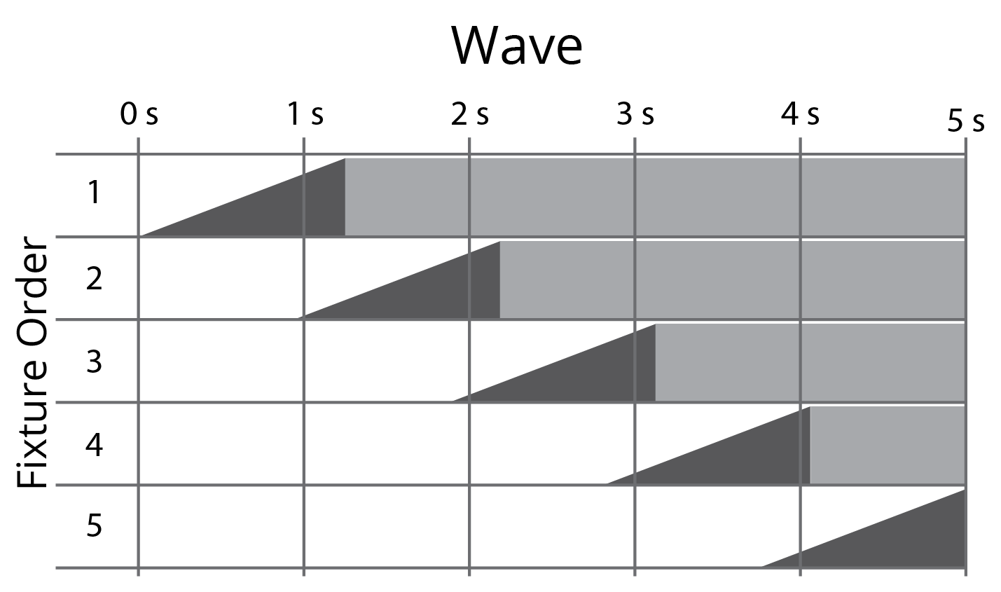 For Wave, the fade-in time for all fixtures within the affected group is equal to a quarter of the set total fade time. This will typically produce an effect similar to a wipe transition with a narrow band of fixtures that change at the same time.