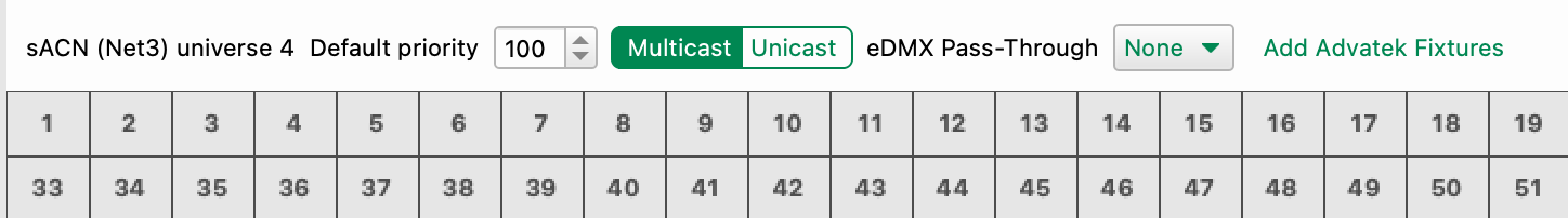 If the chosen universe matches a universe configured as the data source for an Advatek PixLite third -party device, a button Add Advatek Fixtures will be shown above the patch sheet.