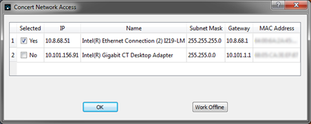 Choose the preferred network interface for the lighting system by selecting the related check box. This selection persists each time Concert is closed and reopened until a network interface changes or the Network Access preference is changed.