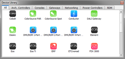 The Device Library shows devices that are known to ETC Concert; meaning the device package for that device has been installed and enabled using the Component Manager. Use the Device Library to add devices to the configuration which are not present on the network. For example, when you are configuring a system offline.
