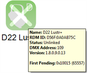 The link state of a device also provides a visual indication in the workspace of the current linked state of the device in the Concert configuration and its linked association with an online network device. ETC Concert determines and automatically associates between a device in the configuration and a discovered device on the network using discrete information such as matching CIDs, matching IP address, by Group/Rack number for dimmer racks, or by RDM ID for RDM devices.