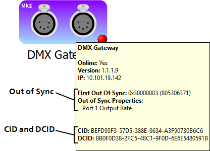 Hovering the mouse pointer over a device icon displays additional information about that device in a tooltip. When the device you are hovering over has properties that are out of sync between the network and the physical device, those properties are identified within the tool tip.