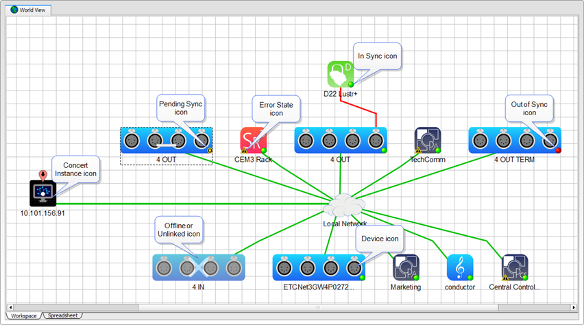 Each device in the workspace is represented by an icon; a graphical representation of the device itself. In addition to the device icon, up to three state icons (indicators) can display to provide visual status indication in the Workspace of each device.