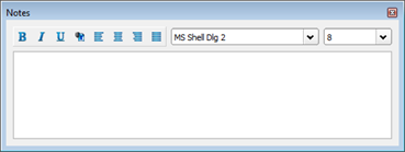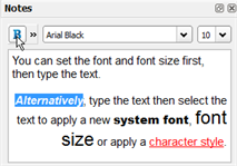 The Notes dock provides tools to change the text font, font size, and apply character formatting to notes text.