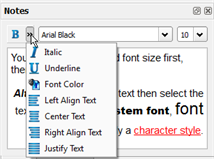To apply character formatting to a letter, word, entire sentence or paragraph, select the text then click the fly-out menu button in the Notes toolbar.