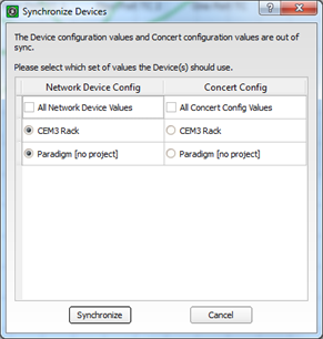 The Synchronize Devices dialog shows when there is a difference between the configuration of hardware devices discovered on the network and the configuration data that is present in ETC Concert.