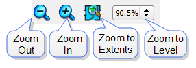 Four zoom tools are available to change the workspace view area including Zoom Out, Zoom In, Zoom to Extents, and Zoom to Level.