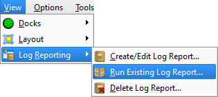 Note: The Run Existing Log Report option is available for selection in the View menu only if there is at least one existing saved log report in the configuration.